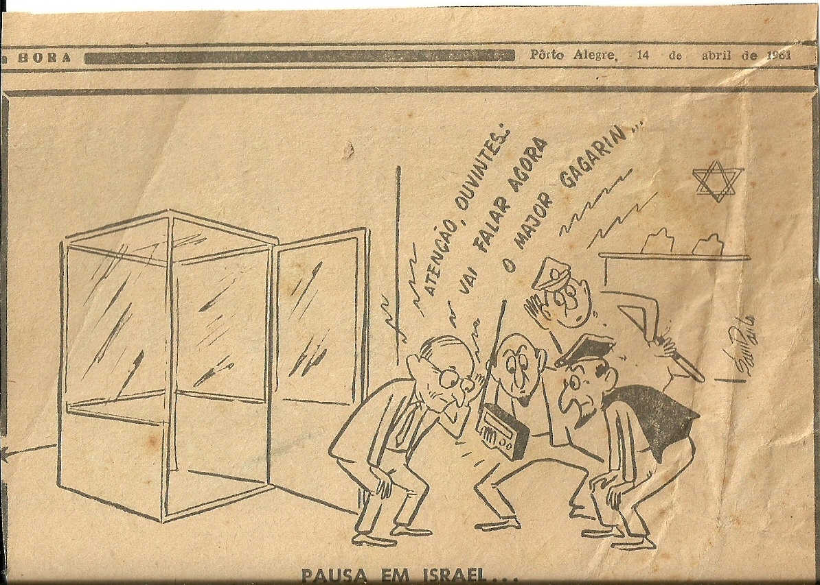 No meu acervo, só encontrei esta charge específica sobre Gagarin. No mesmo dia em que ele fez o seu passeio no espaço, começou em Jerusalém o julgamento de Adolf Eichmann, responsável durante a 2ª Guerra pela deportação de centenas de milhares de judeus para campos de concentração.